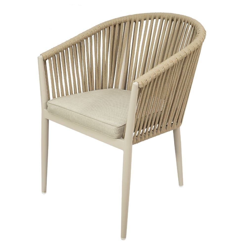 Seu encosto em trama de corda náutica traz um visual moderno e sofisticado, além de proporcionar leveza estética e conforto ao usuário. O assento conta com almofada impermeável, que garante maior praticidade e proteção contra respingos e umidade, tornando a cadeira ainda mais funcional para áreas externas.