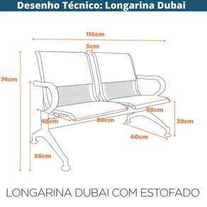 Longarina Estofada 2 Lug NR-17 Dubai Fratini 116 cm Aço Carbono, Cromado e Pintura Cinza c/ Braços